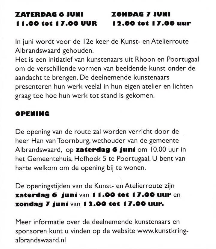 Met de volgende kunstenaars: Marian Klein, Petra Giorgi, Ineke de Jong, Gé Albers, Marleen van Arendonk, Arnoud Bos, Odette Jansen, Mary Helen Roosenschoon,